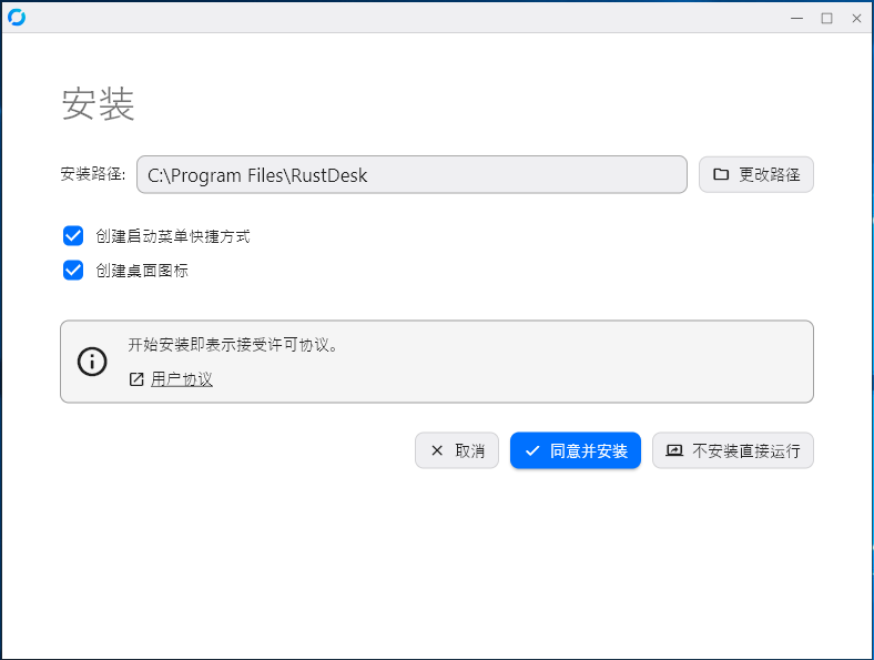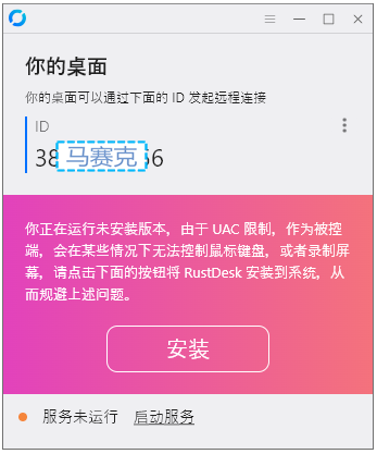 本软件可以免安装运行,点击界面底部的“启动服务”,即可使您的RustDesk处于等待连接状态。