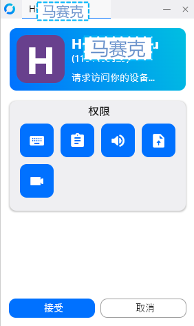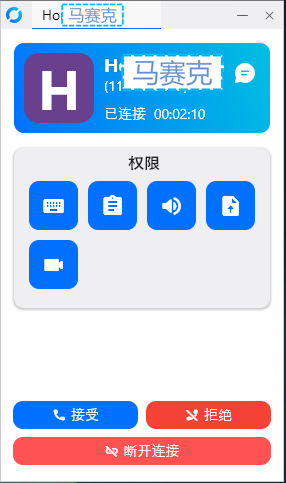 因此,任何人、任何时候对您的桌面发起远程连接请求,都需要您手动点击“接受”同意,方可建立起远程会话连接,如图: